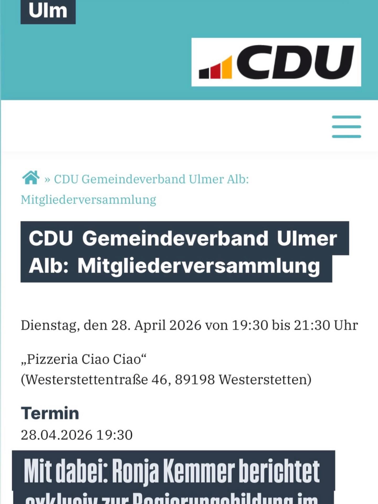 Anfang 2015 wurde aus den Gemeindeverbänden Beimerstetten und Dornstadt-Westerstetten der gemeinsame Gemeindeverband CDU-Ulmer Alb. Durch intensiven Mitgliederzuwachs sind wir zwischenzeitlich einer der mitgliederstärksten Einzelverbandes im Alb-Donau-Kreis.